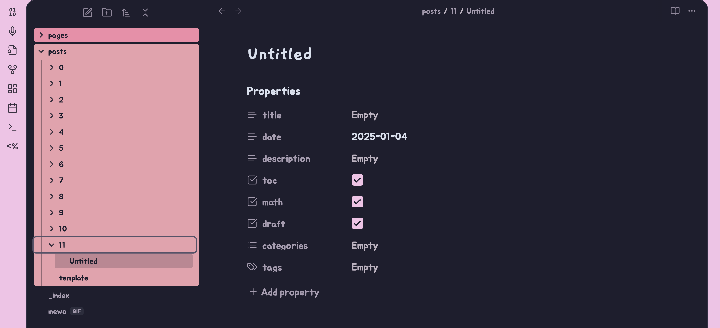 /themesfolder) to create the below folder structure, allowing me to: - add dedicated website pages in/pages- use/poststo hold my site post, with each in its own folder alongside any assets (images, media, etc.). this was done due to my particular workflow (writing in obsidian, see below). - split site configuration into two files for readability in/config: one for parameters (enabling/disabling certain features like social links, metadata etc.), and one for overall config & layout.
