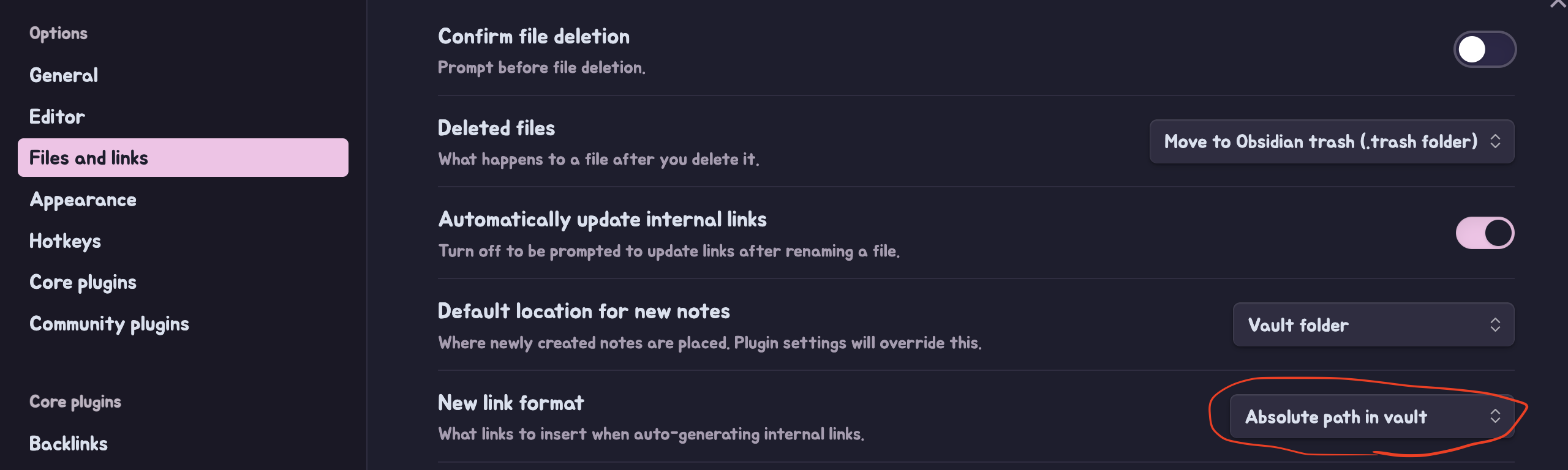 Absolute path in vaultoption is selected in your vault’s Files and links settings. This may need to be tweaked depending on your site’s layout later, but it worked for me, and is easily changed in bulk in VSCode or a similar editor via find & replace.