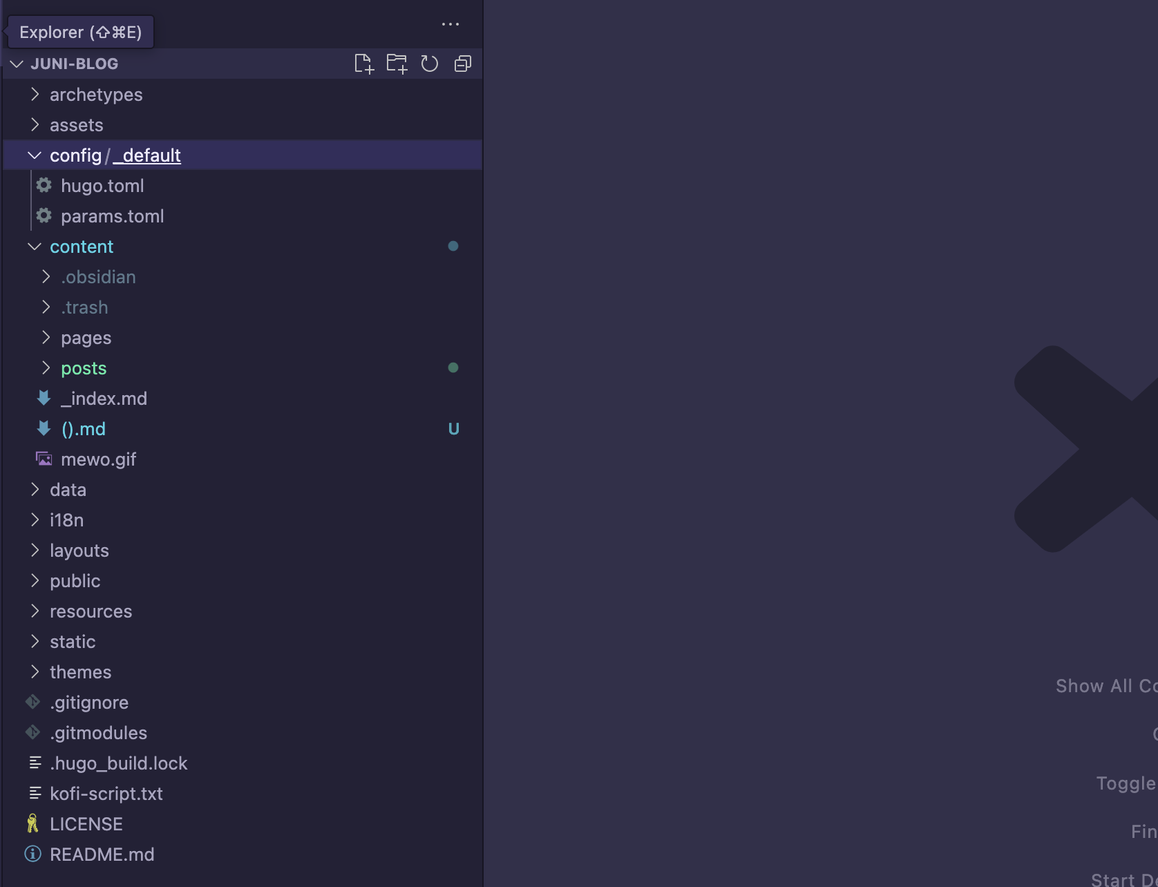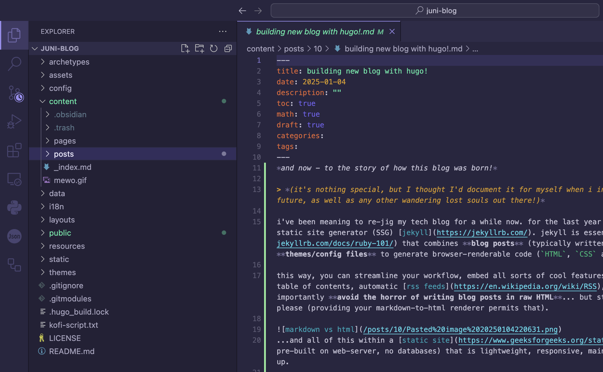 once I’m finished writing, I switch to my full website directory tree in VSCode (my Obsidian “blog” vault is just the website’s