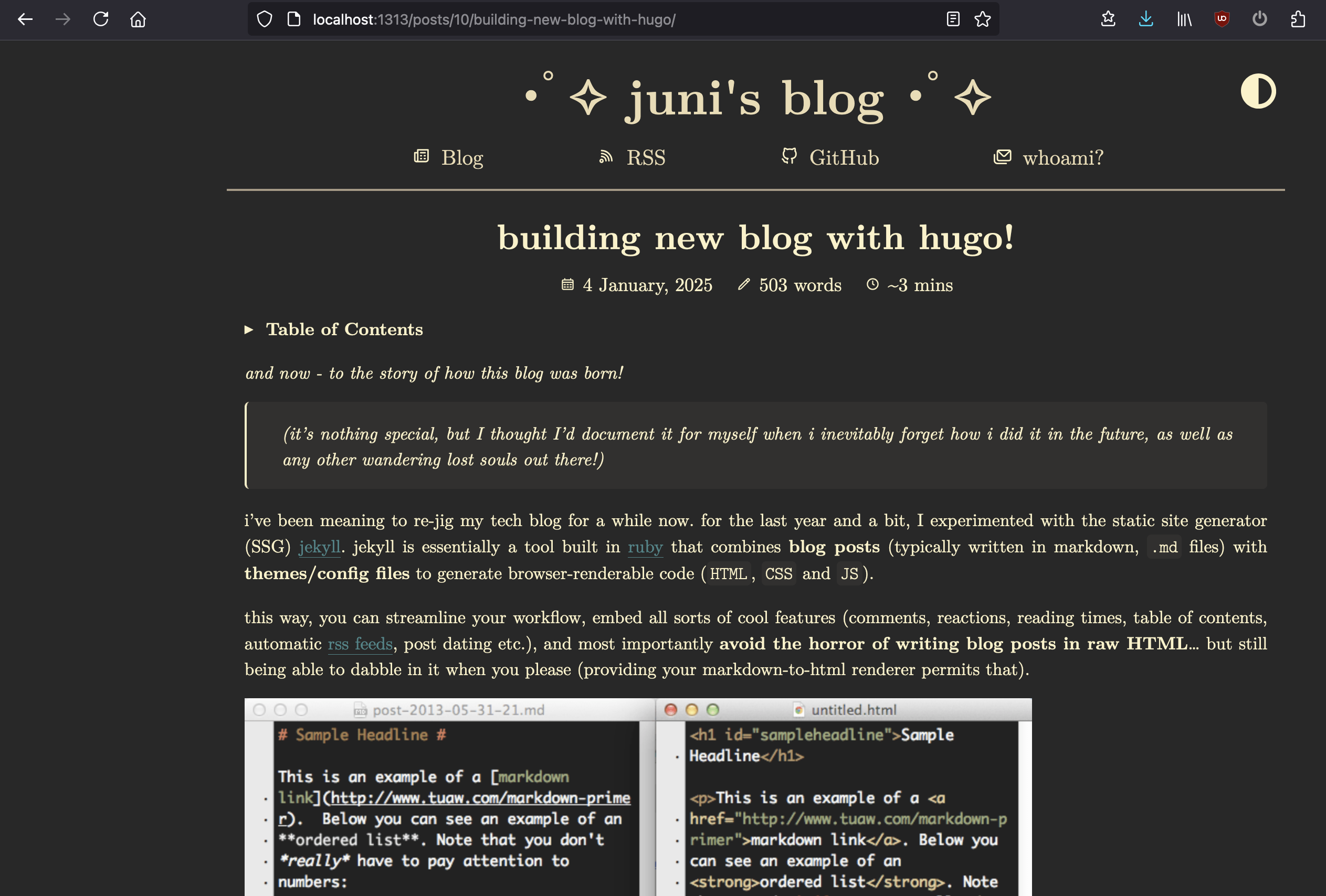 i’ve been meaning to re-jig my tech blog for a while now. for the last year and a bit, I experimented with the static site generator (SSG) jekyll. jekyll is essentially a tool built in ruby that combines blog posts (typically written in markdown, .md files) with themes/config files to generate browser-renderable code (HTML, CSS and JS).