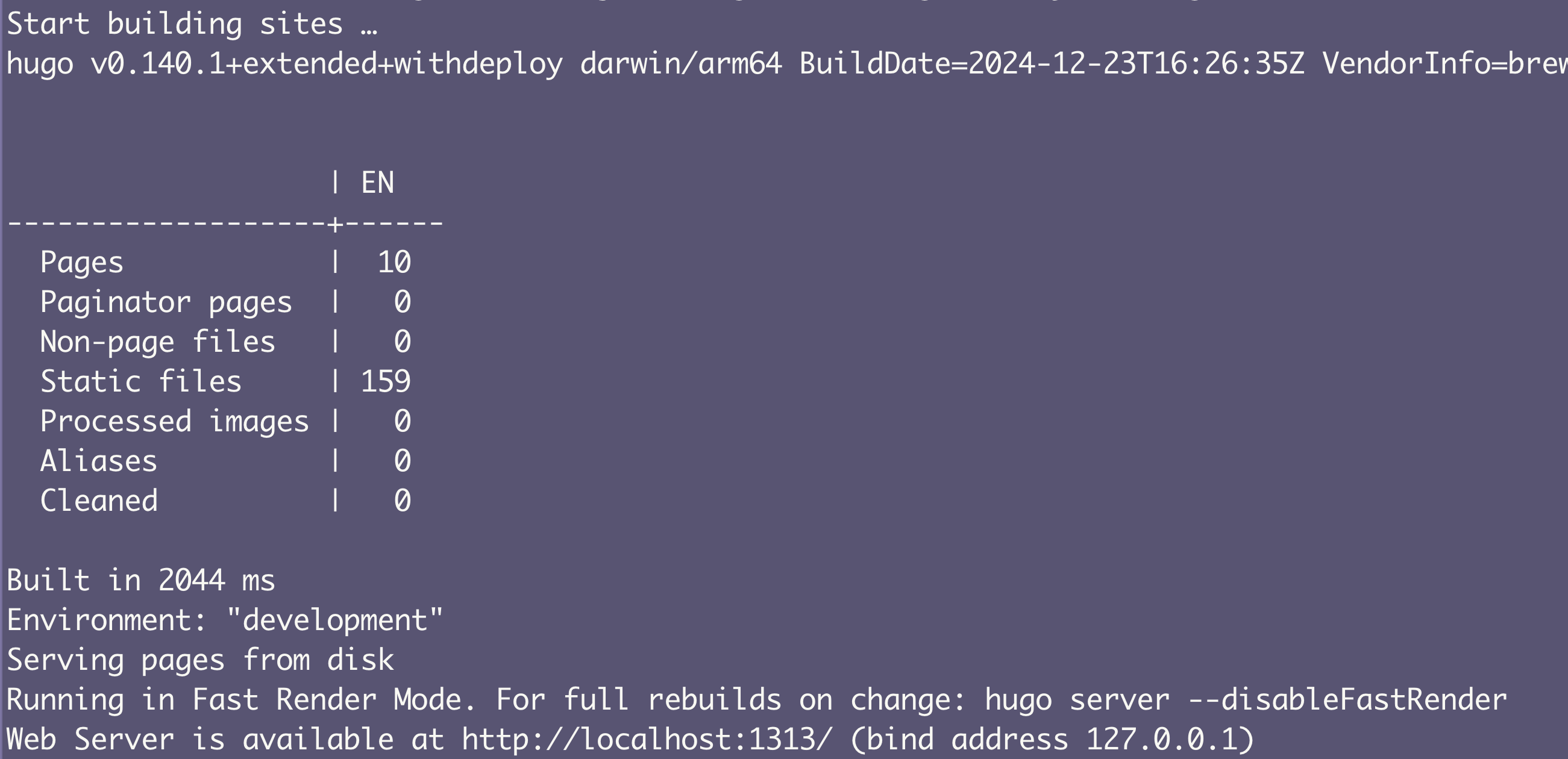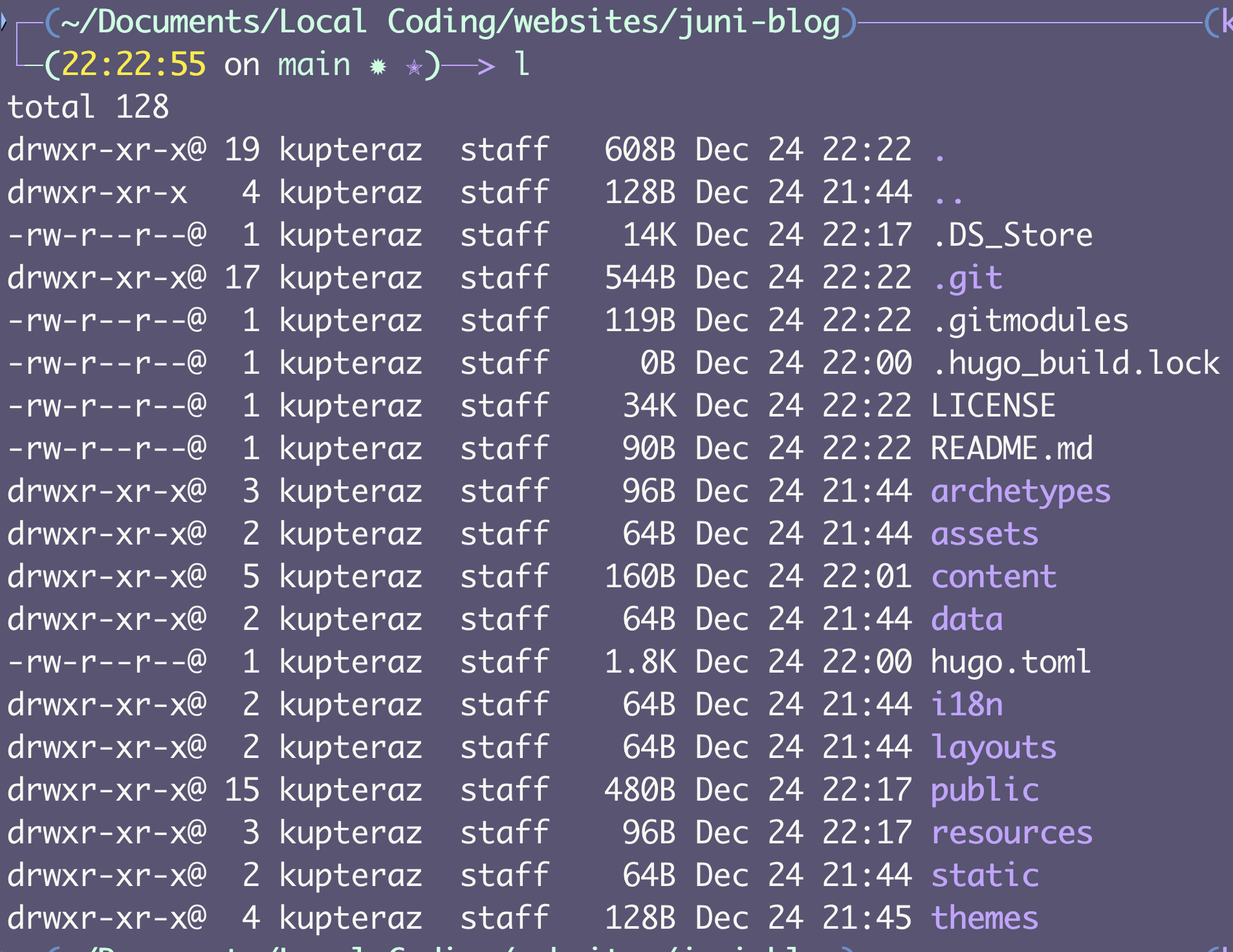 hugo.toml- your site’s configuration variables./content- where you create folders to store blog posts (.md) & site pages/assets- ideally where media is stored & linked (although you can place them anywhere, theoretically, providing you link back to it correctly)/public(only created when website is built, see step 8.) - where your raw website (raw HTML, CSS, JS) will be built to and live. you shouldn’t need to touch this folder./themes- where all of your sites themes are installed (and specified/switched between inhugo.toml)