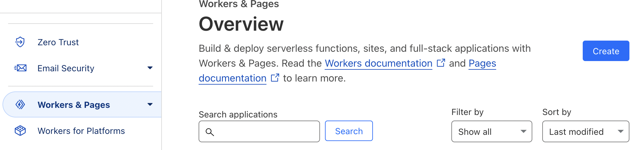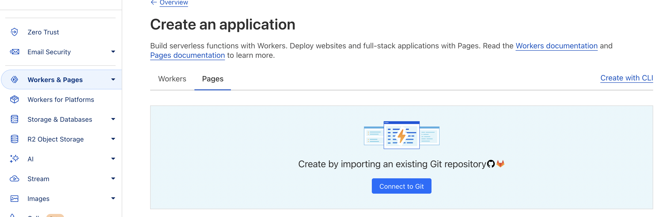 Workers & Pagessection, thenCreateto deploy a new “site”. The clickConnect to Gitand follow the prompts to authenticate, and link to the repository that you just pushed to.