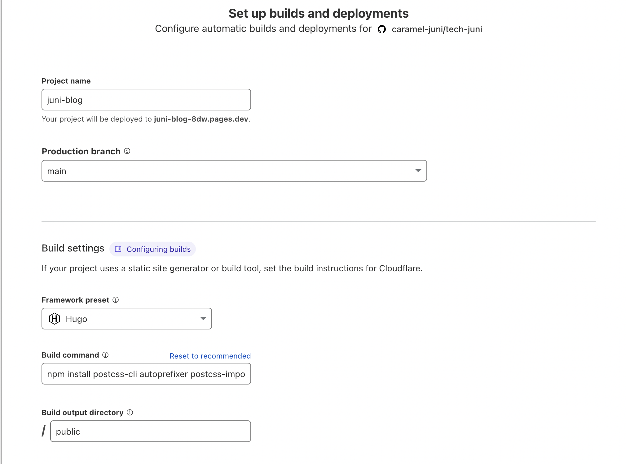 main), and if detected, it will automatically runnpm install postcss-cli autoprefixer postcss-import && hugoon its remote server(s) to build the updated version of my site, and then serve only the created HTML, CSS & JS files in the specified output directory (for me,public). you should be able to access your site from the default URL created and provided to you, like https://b3ce9f44.juni-blog.pages.dev/. -