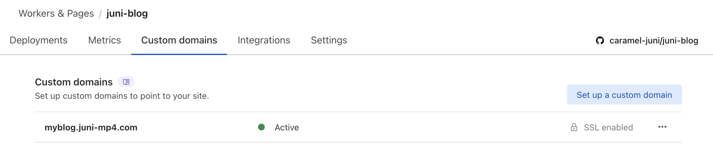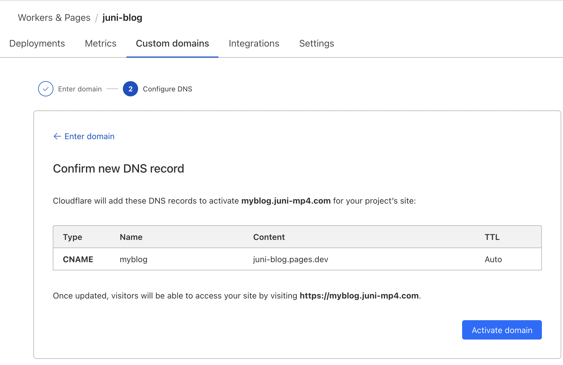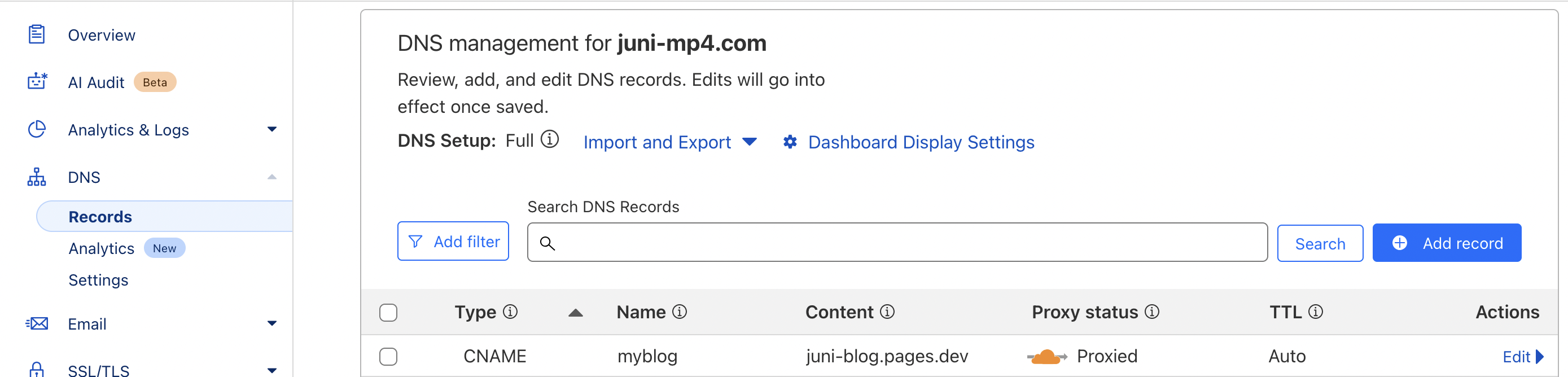 myblogCNAME with this “Page” (juni-blog.pages.dev).