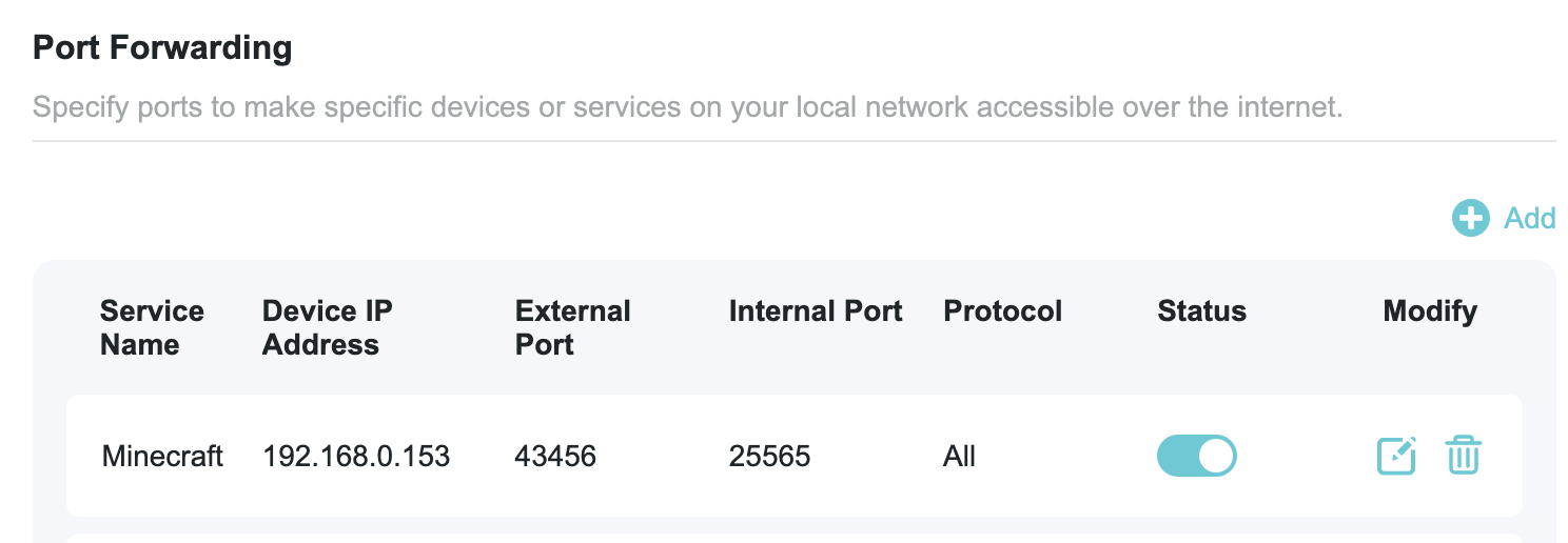 Additionally, I’ve set up a DNS A recordfor the domain I own to point at my router’spublic IP, so I can access my server (and share it) withmy-domain:43456.