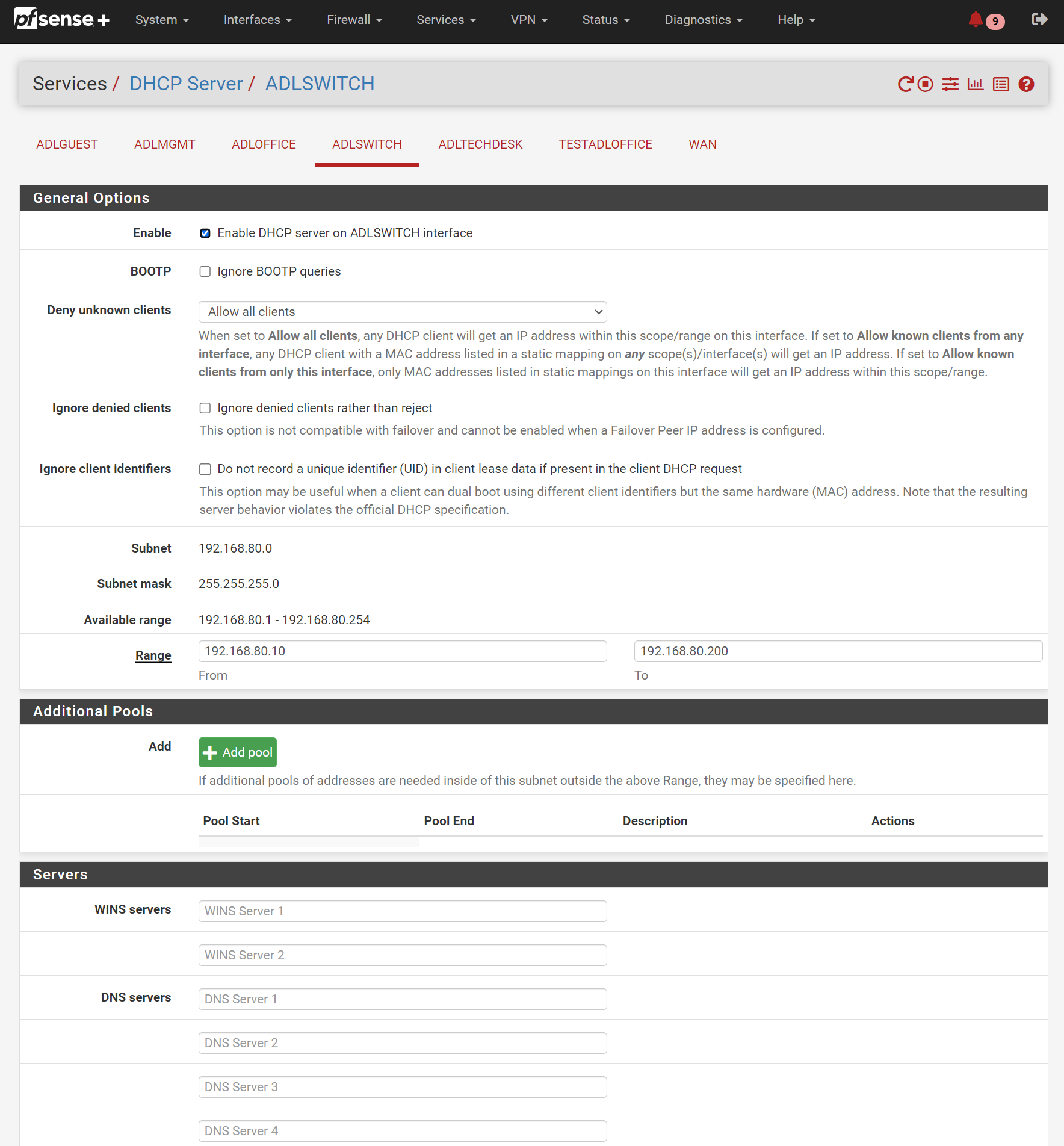 ADLSWITCHfor me).Here, we can set the pool of IP addresses this interface will assign to connected devices on