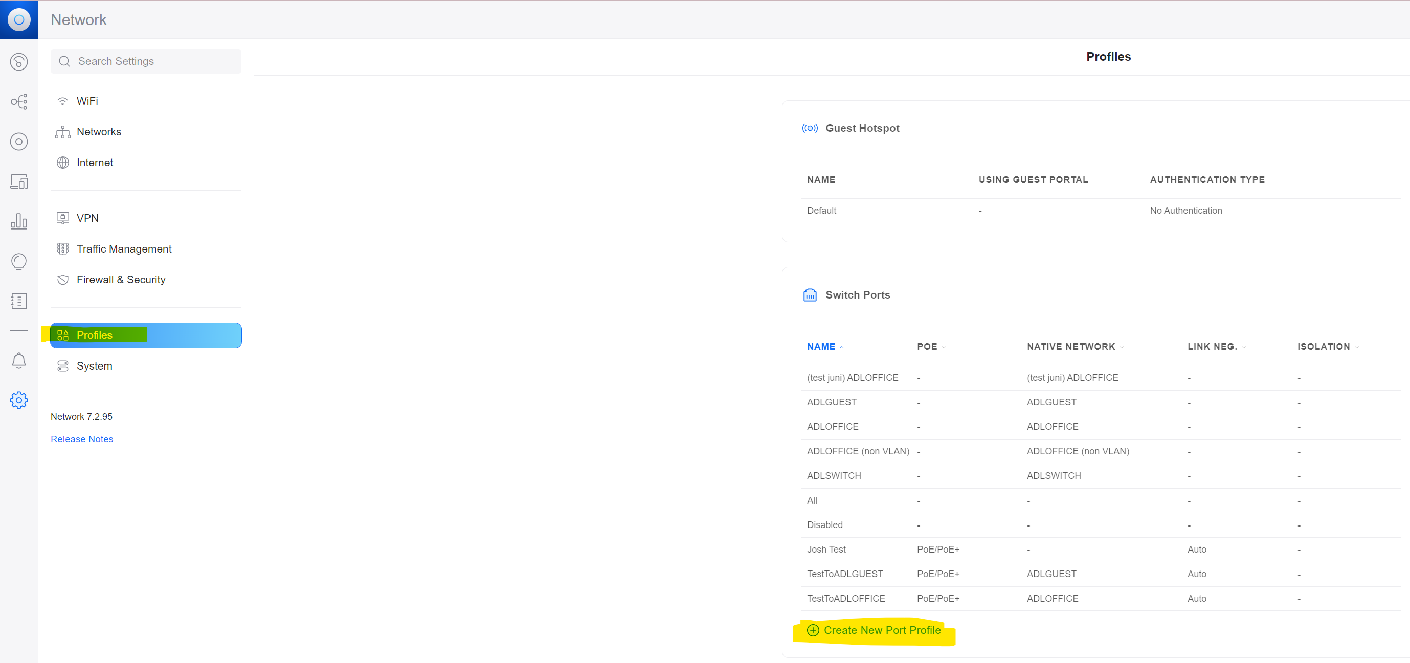 Here, create a port profile with the native network being set as whatever VLAN-ONLY network you want all passing traffic tagged as. E.g. by setting the native network to the UniFi network we just created will add the