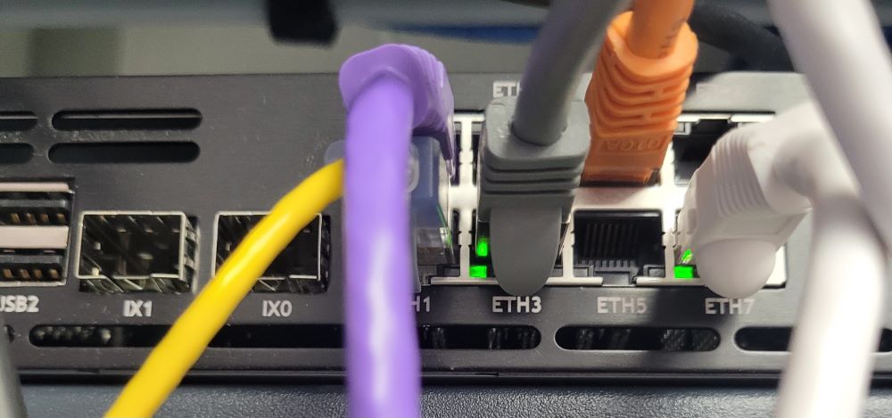 Plug in an ethernet cable to an unused port on the pfSense box. In my case, this is ETH3 (gray cable).