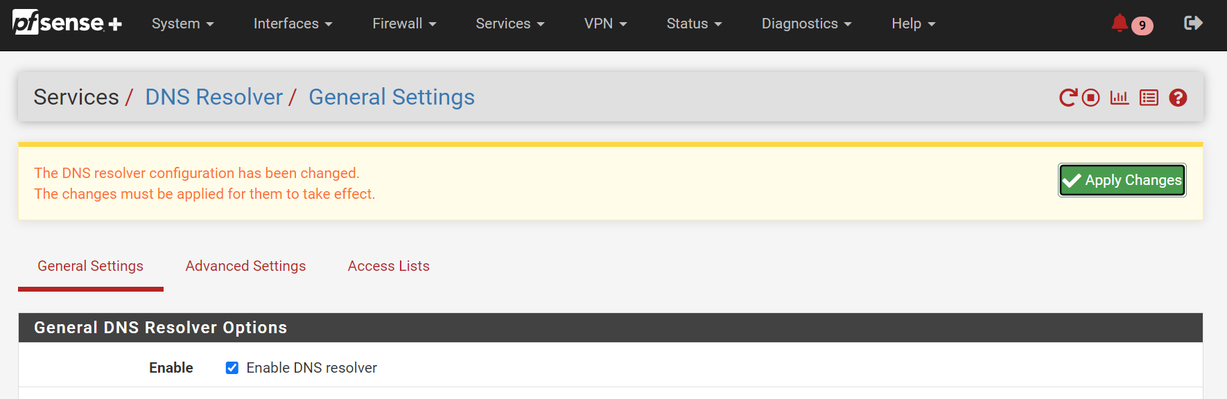 Go to Services / DNS Resolver and check that Network Interfaces has “All” selected. This is very important - and will ensure the DNS Resolver will know to look for and operate on your new network interface.