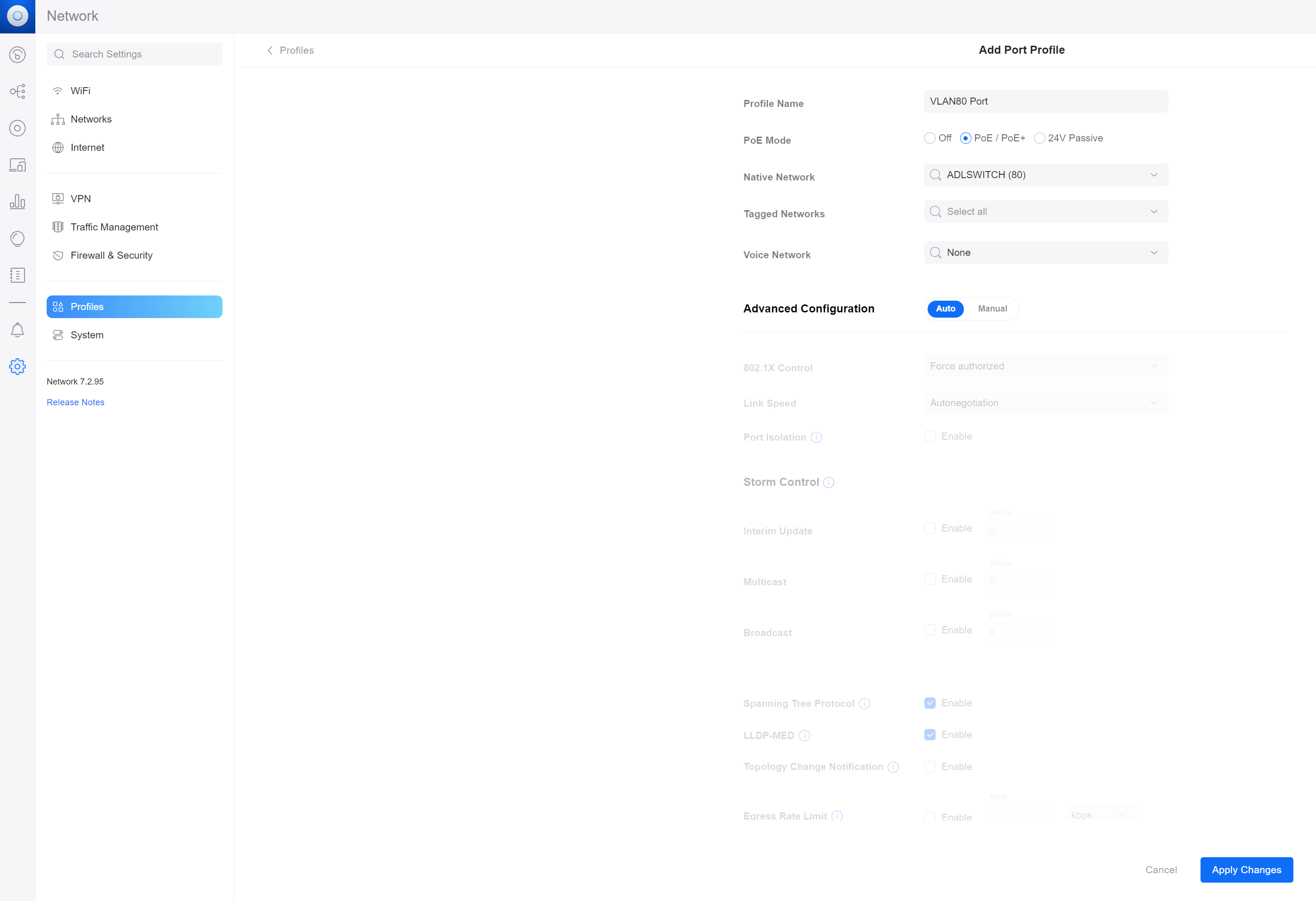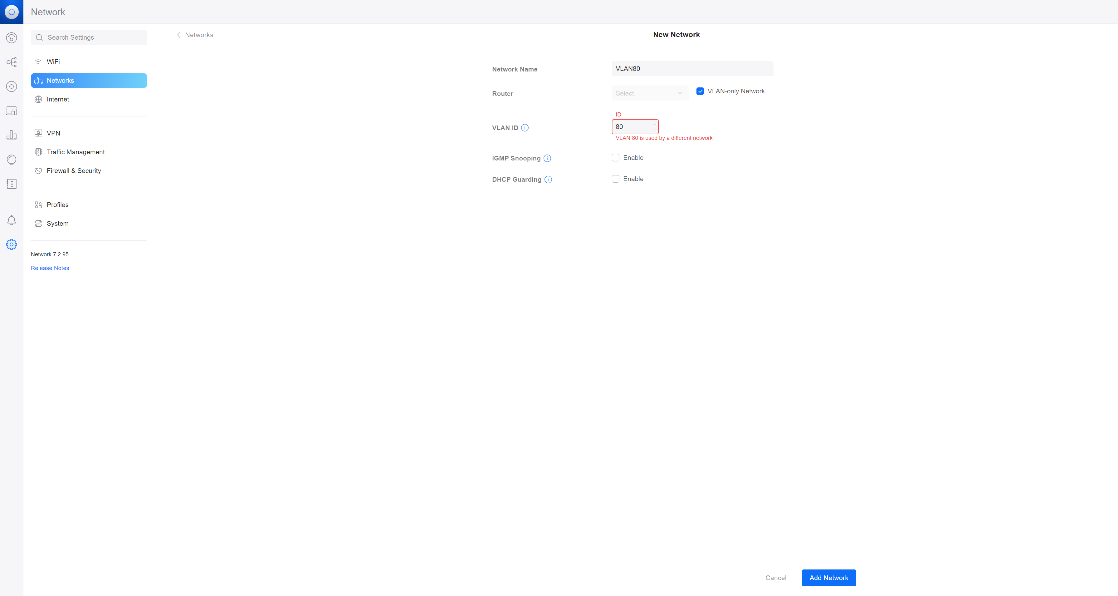 VLAN-onlyUniFi ‘Network’, specifying the same VLAN ID as set in pfSense (in my case,80- these MUST MATCH between UniFi & pfSense!).