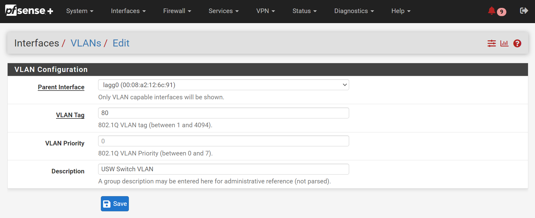 Save.NOTE: ALWAYS ADD 9 & 10 as tagged members by default (WHY this must be done is beyond the scope of this tutorial but perhaps write an article about it soon as it explains a lot about how the internals of pfSense actually functions. alternatively, for the curious, read the docs here)